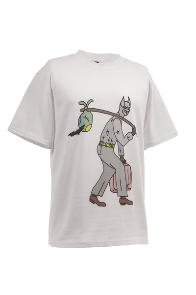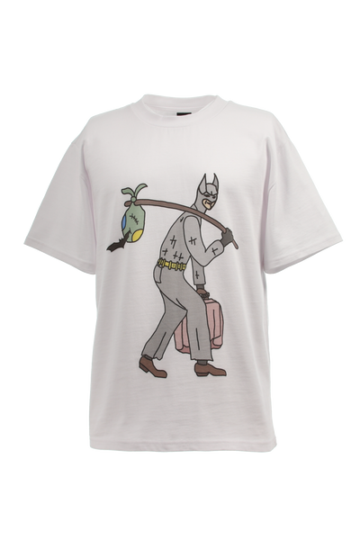 The piece features the Bat in a grey suit, carrying a makeshift bindle patched with bright colors, and a small batcage in hand.